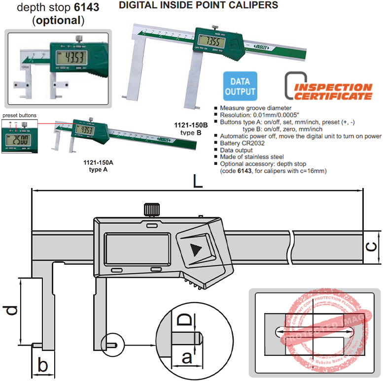 INSIZE 1121 Digital Inside Point Caliper merupakan alat ukur yang digunakan untuk secara tepat menentukan lebar celah atau benda, jauh lebih akurat daripada pita pengukur atau penggaris. Kaliper digital ini memiliki fitur tahan nilai ukur untuk metode pengukuran berulang karena mekanisme ukurnya digital Skala mistar vernier yang akurat antara sepasang rahang ukur bawah untuk celah/cekungan internal groove. Kaliper digital ini juga paling ekonomis dikelasnya.