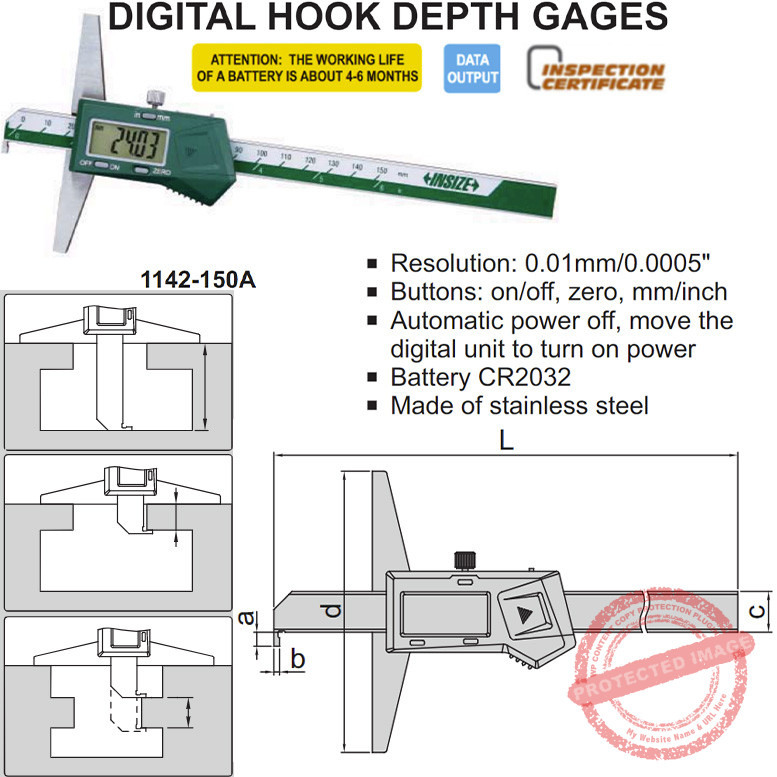 INSIZE 1142 Digital Hook Depth Gage (Graduation: 0.01mm) 150mm – 1500mm merupakan alat ukur ekonomis untuk mengecek kedalaman ceruk, lubang, rongga dan groove pada beragam material kerja yang membutuhkan tumpuan datar dan dan memiliki ujung anvil bertangkai. Mata ukur anvilnya berbentuk flat dengan desain frame klasik yang berlapis enamel dan ditambah dengan marking skala Vernier.
