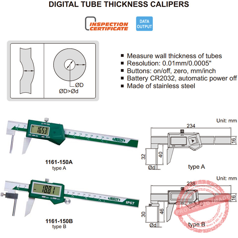 INSIZE 1161-150 Digital Tube Thickness Caliper merupakan alat ukur yang digunakan untuk secara tepat menentukan lebar celah atau benda, jauh lebih akurat daripada pita pengukur atau penggaris. Kaliper digital ini dibuat sesuai Standar DIN 862 dan memiliki fitur tahan nilai ukur untuk metode pengukuran berulang. Karena mekanisme ukurnya digital, kaliper ini mampu mengurangi kesalahan estimasi manusia. Khusus seri 1161-150B, dilengkapi dengan penyetelan arah sudut ukur jaw silinder. Skala mistar vernier yang akurat antara dua rahang ukur juga memiliki graduasi interpolasi tanpa roller mekanis pengunci.