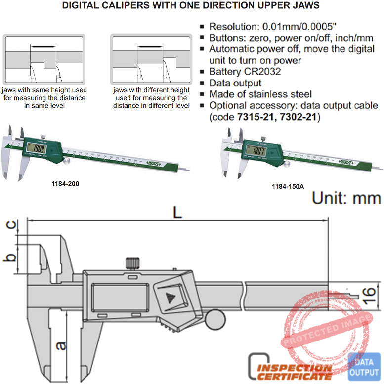 INSIZE 1184 Digital One Direction Upper Jaw Caliper merupakan alat ukur yang digunakan untuk secara tepat menentukan lebar celah atau benda, jauh lebih akurat daripada pita pengukur atau penggaris. Kaliper digital ini dibuat sesuai Standar DIN 862 dan memiliki fitur tahan nilai ukur untuk metode pengukuran berulang. Kaliper digital ini punya duat tipe rahang atas searah kekiri dengan tinggi yang sama dan model rahang dengan tinggi yang berbeda. Rahang ukur atas dan bawah bisa digeser untuk memudahkan pengukuran bagian yang jadi tumpuan ukur.