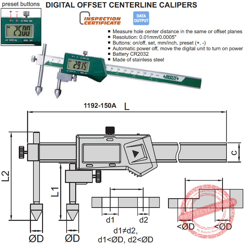 INSIZE 1192 Digital Offset Centerline Caliper merupakan alat ukur linear yang digunakan untuk secara tepat menentukan lebar celah berupa lubang silinder, maupun lubang fastener kerucut atau yang sudah countersink. Kaliper digital memiliki rahang bawah dengan permukaan ujung mata anvil conical berbentuk kerucut yang tajam dan berfungsi sebagai tumpuan. Ideal untuk mengukur jarak antar lubang dengan diameter yang sama dan mengukur pitch antara 2 lubang dengan diameter tipe Countersink dari permukaan ujung ke lubang maupun bentuk relief silinder. Ketinggian batang sebelah kiri juga bisa diatur. kaliper digital ini bisa digunakan untuk mengukur lembah dan pitch pada komponen fastener berukuran besar, gardan, gerigi dan lainnya.