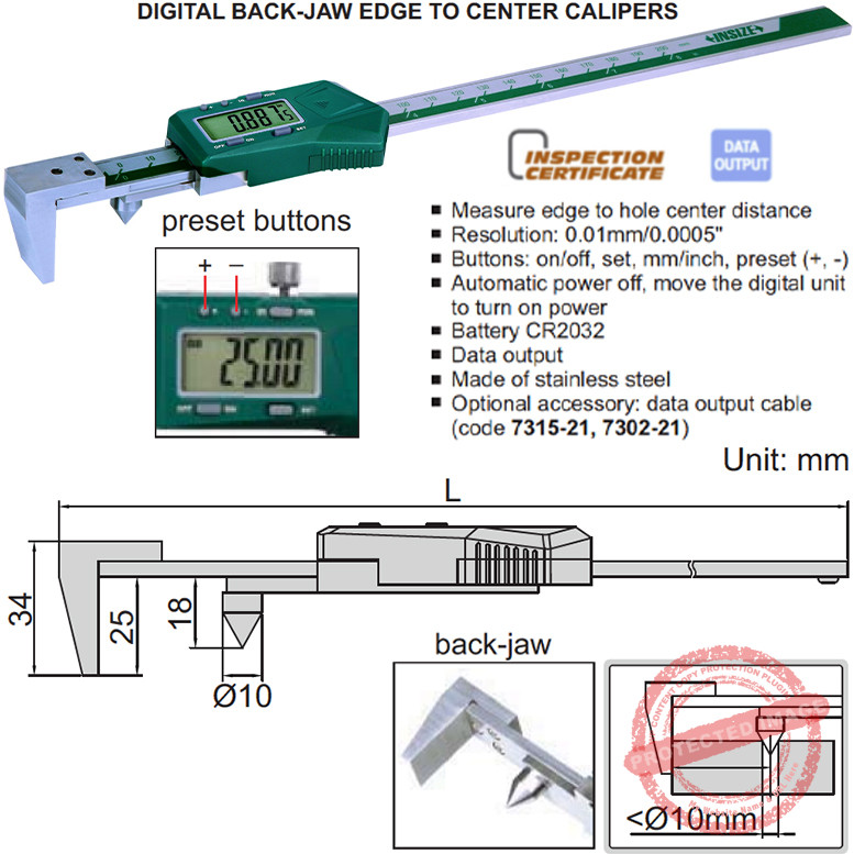 INSIZE 1524 Digital Back-Jaw Edge to Edge Caliper merupakan alat ukur linear yang digunakan untuk secara tepat menentukan lebar titik tengah dan tepian keliling melingkar. Kaliper digital ini memiliki sepasang rahang bawah dengan permukaan ujung mata anvil conical berbentuk kerucut yang tajam dan kombinasi rahang flat pada bagian atas yang berfungsi sebagai tumpuan.