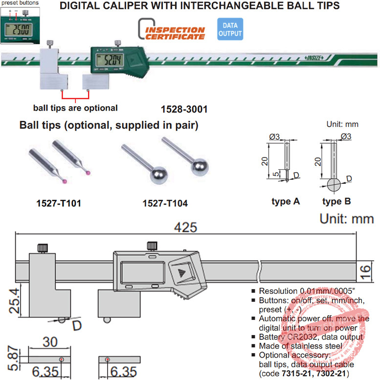 INSIZE 1528-3001 Caliper with Interchangeable Ball Tip merupakan alat ukur linear yang digunakan untuk secara tepat menentukan lebar celah atau benda, maupun jig ukur. Kaliper digital ini memiliki fitur tahan nilai ukur untuk metode pengukuran berulang sesuai standar DIN 862. Karena mekanisme ukurnya digital, kaliper ini mampu mengurangi kesalahan estimasi manusia. Skala mistar vernier yang akurat memiliki graduasi interpolasi dan kunci mekanis dikedua sisi rahang ukur.