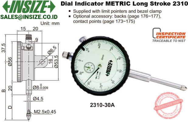 Fitur INSIZE Dial Test Indicator 2310-FA Long Travel (Resolution 0.01mm) Accuracy 25μm, Range: 20mm – 30mm: