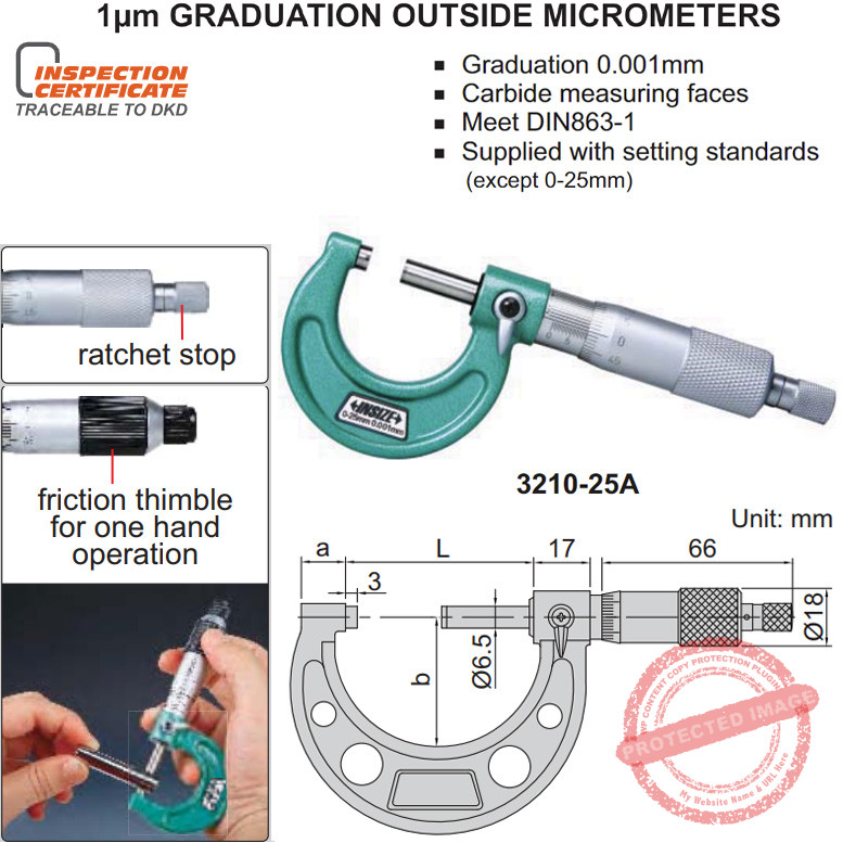 Mikrometer atau biasa disebut mikrometer sekrup INSIZE 3210 Micrometer (Graduation: 1μm) menggunakan 2 mekanisme interpolasi putar, yaitu secara gardan friksi untuk putaran besar dan sistem poutar ratchet yang presisi. Ujung mata ukur anvil terbuat dari logam keras Carbide yang tahan gores. Metode penggunaan Mikrometer Putar bidal berlawanan arah jarum jam untuk memegang objek yang diukur dengan landasan (sisi tetap) dan spindel. Kemudian, putar idling stopper atau thimble 1 ~ 3 kali untuk mengukur. Menggunakan stopper bisa meningkatkan tekanan pengukuran.