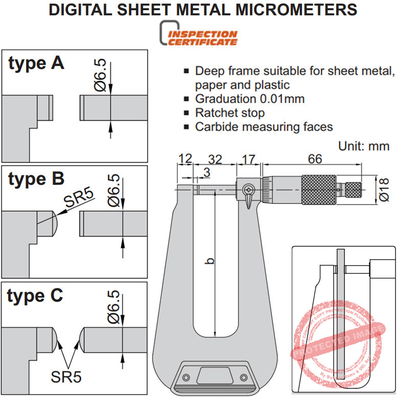 Mikrometer atau biasa disebut mikrometer sekrup INSIZE 3239 Sheet Metal Micrometer menggunakan 2 tipe mekanisme interpolasi yang merupakan kombinasi putar sistem putar ratchet yang presisi dan friksi dengan kuncian. Ujung mata ukur anvil terbuat dari logam keras Carbide yang tahan gores.