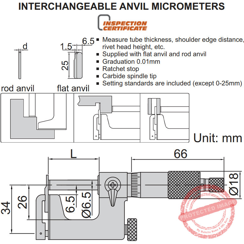 INSIZE 3262 Interchangeable Anvil Micrometer (Graduation: 0.01mm) merupakan alat ukur ketebalan lembaran material dengan frame dalam dan sepasang mata ukur anvil yang cembung agar cocok untuk ukur pelat logam, kertas dan plastik. Dengan desain frame klasik yang berlapis enamel dan ditambah dengan marking skala Nonius. Bagian bawah dari rahang ukur polos yang aman digunakan saat dengan tangan.