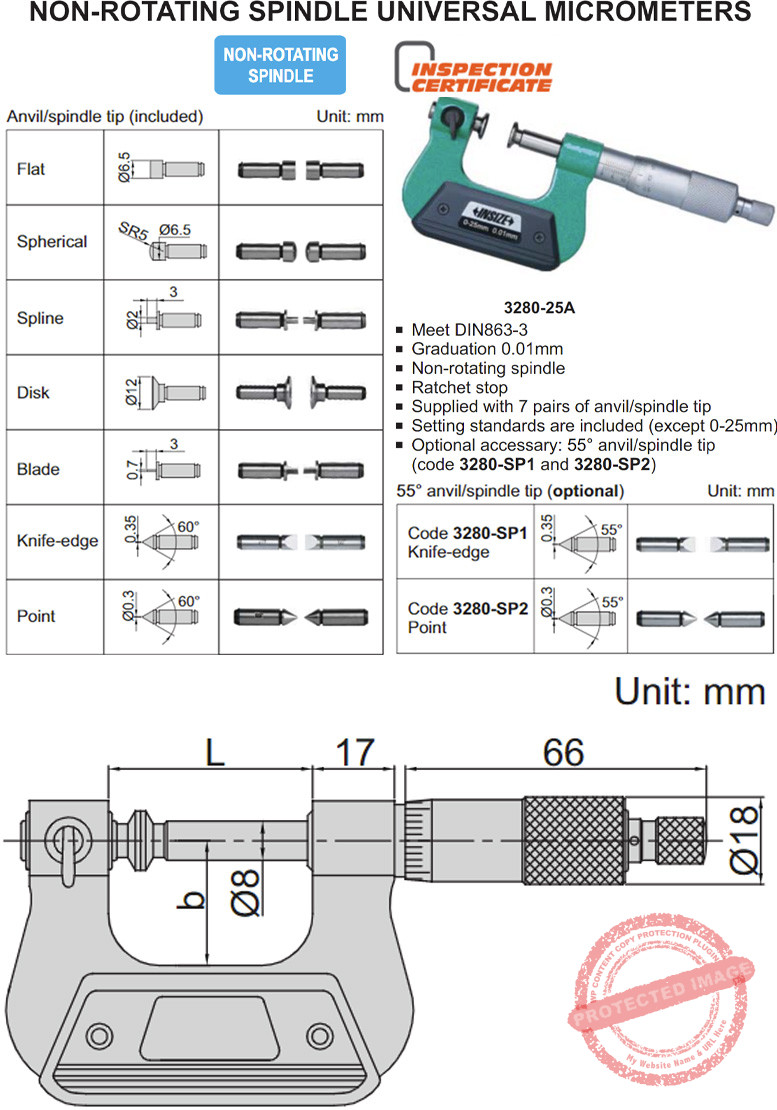 Mata ukur anvilnya bisa dilepas pasang untuk hampir semua keperluan ukur. Ujung mata ukur anvil terbuat dari logam keras Carbide yang tahan gores. Dengan desain frame klasik yang berlapis enamel dan ditambah dengan marking skala Nonius. Bagian bawah dari rahang ukur dilengkapi dengan elastomer Polymer yang aman digunakan dengan stand ukur. Mikrometer atau biasa disebut mikrometer sekrup