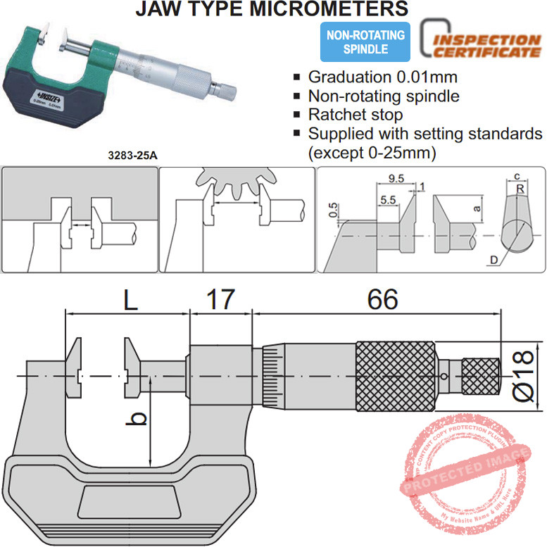 Mikrometer atau biasa disebut mikrometer sekrup INSIZE 3283 Jaw Type Micrometer menggunakan 2 tipe mekanisme interpolasi yang merupakan kombinasi putar sistem putar ratchet yang presisi dan friksi dengan kuncian. Ujung mata ukur anvil terbuat dari logam keras Carbide yang tahan gores. Anda bisa rekam data ukurnya ke software spreadsheet komputer dengan kabel data yang dijual terpisah.