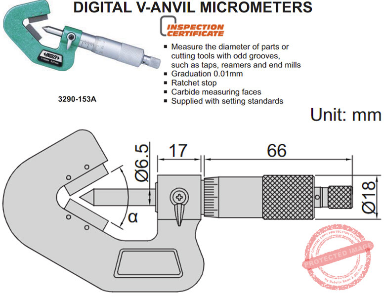 Mikrometer vernier sekrup INSIZE 3290 V-Anvil Micrometer menggunakan 2 tipe mekanisme interpolasi yang merupakan kombinasi putar sistem putar ratchet yang presisi dan friksi dengan kuncian. Ujung mata ukur anvil terbuat dari logam keras Carbide yang tahan gores. Harga yang tertera disini merupakan referensi untuk INSIZE 3290-455A.