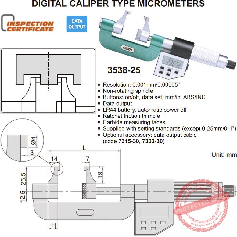 Mikrometer atau biasa disebut mikrometer sekrup INSIZE 3238 Caliper Type Micrometer menggunakan 2 tipe mekanisme interpolasi yang merupakan kombinasi putar sistem putar ratchet yang presisi dan friksi dengan kuncian. Ujung mata ukur anvil terbuat dari logam keras Carbide yang tahan gores. Anda bisa rekam data ukurnya ke software spreadsheet komputer dengan kabel data yang dijual terpisah.