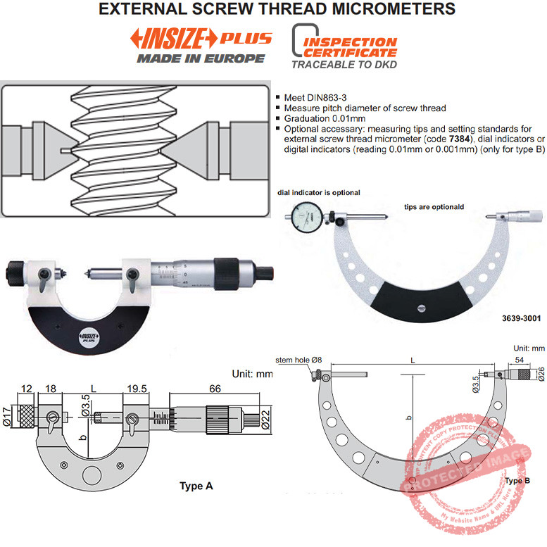INSIZE 3639 External Screw Thread Micrometer ini menggunakan mekanisme sekrup dan ratchet presisi dengan akurasi ±4μm. Ada dua tipe yang ditawarkan; Tipe A dengan mata anvil permanen dan tipe B dengan mata ukur anvilnya yang bisa dilepas pasang berdiameter batang Ø8mm. Anda bisa gunakan Dial indicator tambahan untuk berbagai keperluan pengukuran cepat dan penentuan parameter ukur, maupun dipadukan sebagai jig dengan alat ukur lain.