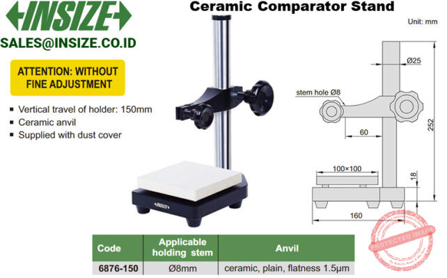 INSIZE 6876 merupakan Comparator Stand dengan base batu keramik untuk holder pemegang alat ukur Tes indikator secara vertikal. Berdasarkan aplikasinya, anda bisa gunakan Test stand ini hanya untuk pengujian dimensi umum, namun tidak cocok untuk menggantikan test stand untuk pengujian tekan.