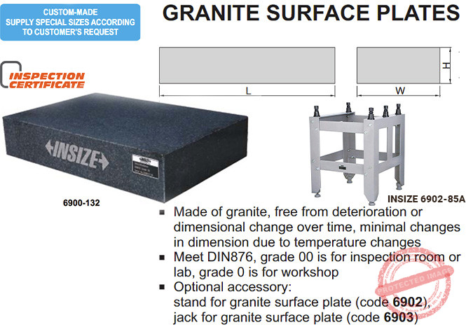 INSIZE 6900 Granite Surface Plate (Grade 00) merupakan solusi surface plate granite premium untuk meja kerja pengukuran presisi terkalibrasi untuk akurasi terbaik. Pelat permukaan datar dan permukaan bidang surface plate dari batu granite ini digunakan sebagai ruang referensi horizontal untuk pengukuran dimensi. Oleha karena fungsinya yang vital sebagai dasar untuk inspeksi, tentu surface plate yang terkalibrasi bisa diandalkan untuk rutinitas pengukuran, spotting, penandaan, dan media dasar dalam pengukuran komparatif.