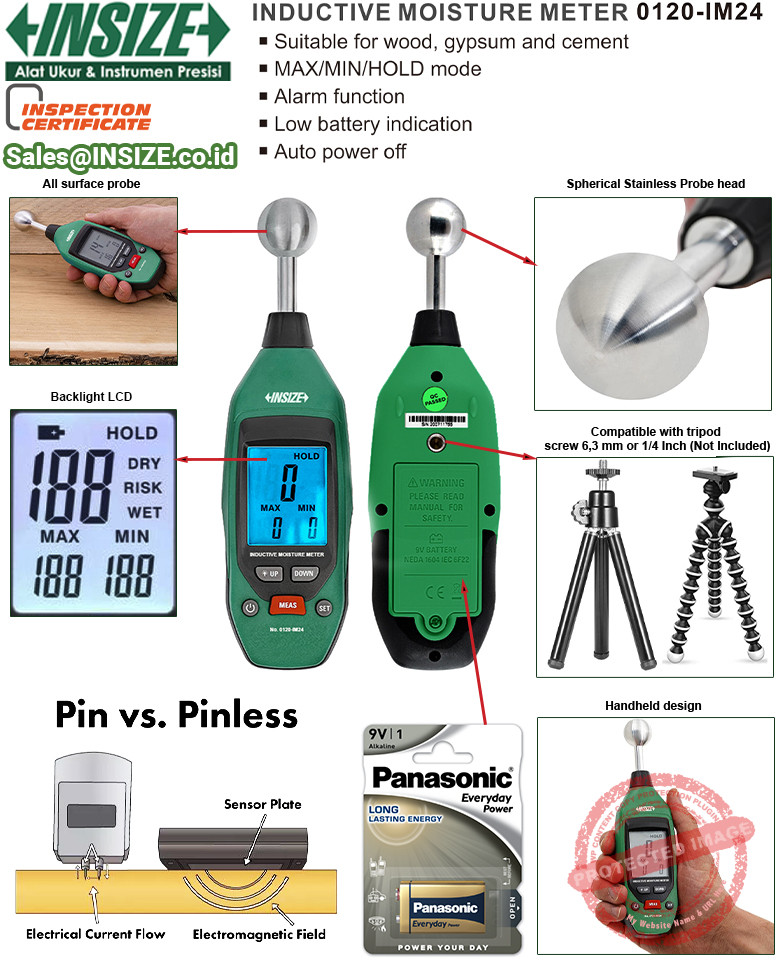 Kontras tinggi dari layar LCD menampilkan numerik digit dengan fungsi tahan nilai ukur dan Fungsi alarm yang mengindikasikan parameter Min/Max, serta Indikator level baterai. INSIZE Moisture Meter 0120-IM24 juga dilengkapi dengan dudukan Adaptor tripod internal yang bisa menggunakan beragam jenis tripod standar kamera. Harap perhatikan bahwa akurasi pengukur tanpa pin ini juga tergantung dari tipe kepadatan dan porositas dari material maupun kemampuan material tersebut menyerap air di permukaan. Material yang memiliki pori-pori lebih besar dan struktur yang bisa menampung air tentu memiliki kepadatan dan kemampuan perambatan magnetis yang lebih tinggi daripada material kering yang pori-porinya sangat kecil atau material logam yang sudah terlalu korosif terkikis karat maupun sedimentasi.