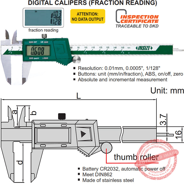 Karena mekanisme ukurnya digital, kaliper ini mampu mengurangi kesalahan estimasi manusia. Skala mistar vernier yang akurat antara dua rahang ukur juga memiliki graduasi interpolasi dan roller mekanis pengunci. INSIZE 1102 Caliper ini memiliki fitur tampilan pecahan atau Fraction untuk satuan ukur imperial.
