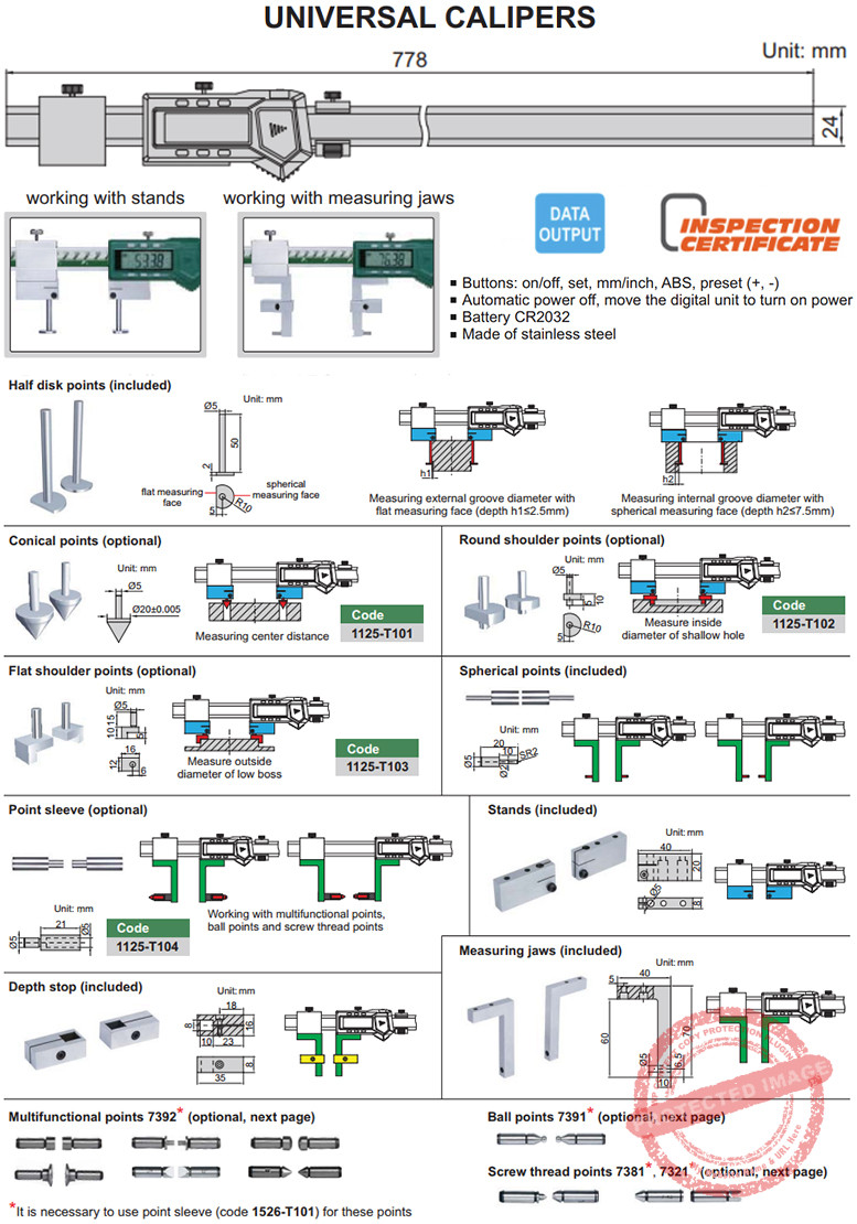 Order Guide for INSIZE Universal Caliper 600mm, Cable Output, 1125-600 :