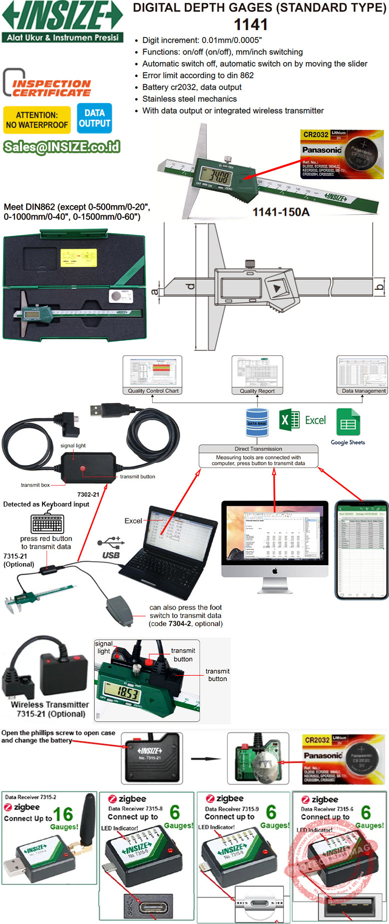 INSIZE 1141 Digital Depth Gage ini TIDAK TAHAN air. Anda bisa rekam data ukurnya ke software spreadsheet komputer dengan kabel data yang dijual terpisah. Harga yang tertera disini merupakan referensi untuk iNSIZE 1141-150A.