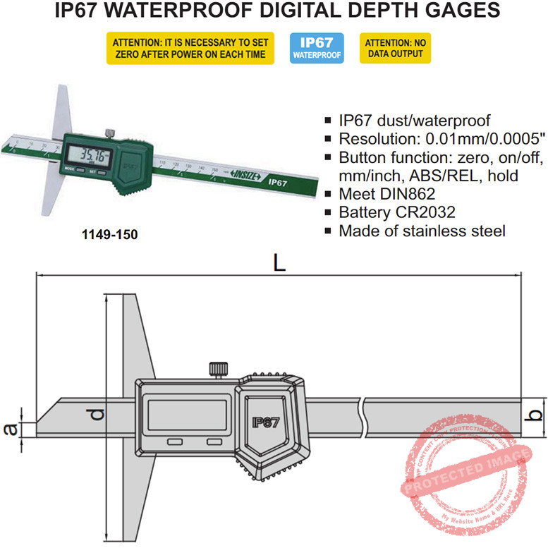 INSIZE 1149 Waterproof Digital Depth Gage menggunakan sistem sensor ukur linear scale yang presisi dan friksi dengan penyetelan kuncian. Harap perhatikan bahwa INSIZE 1149 Waterproof Digital Depth Gauge ini tidak memiliki output data. Harga yang tertera disini merupakan referensi untuk INSIZE 1149-150.