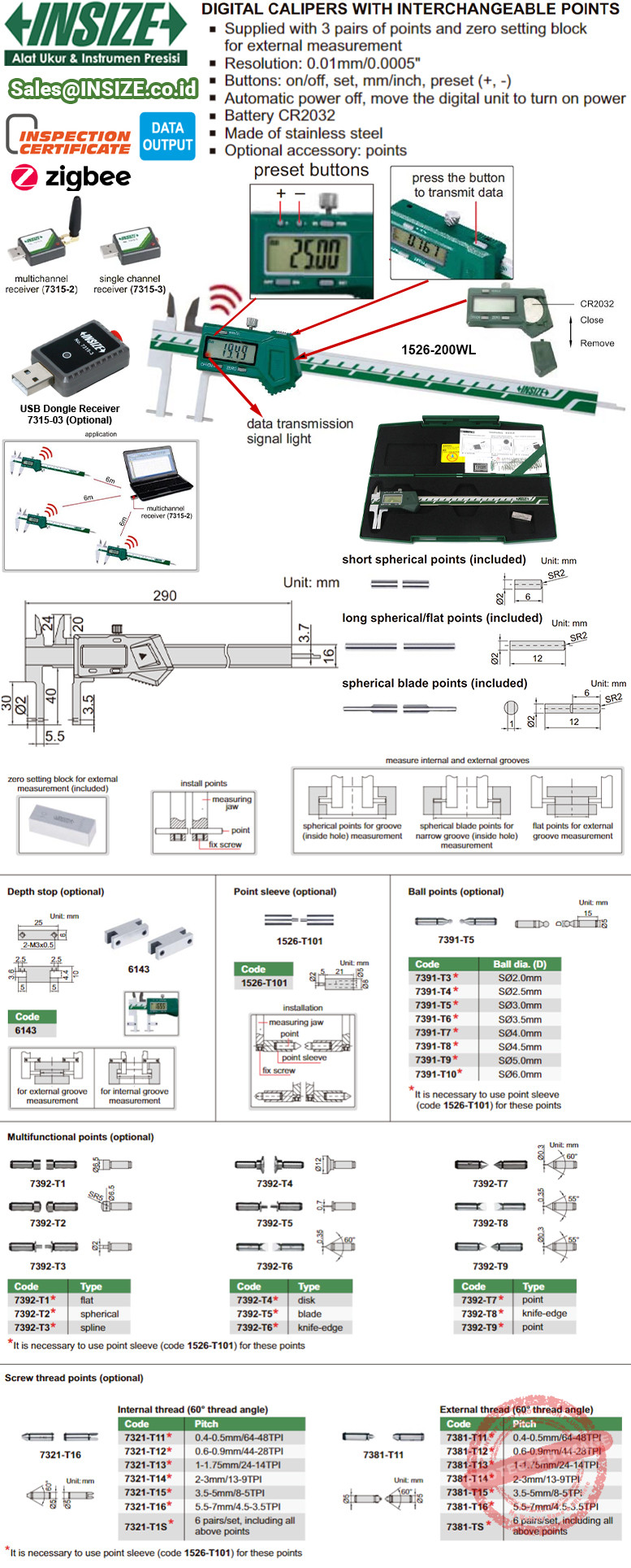 Mata anvilnya bisa dilepas-pasang dan mempermudah pengukuran langsung karena perhitungan tidak diperlukan. Skala mistar vernier yang akurat memiliki graduasi interpolasi dan roller mekanis pengunci. INSIZE 1526-200WL Interchangeable Points Caliper ini menggunakan sensor linear encoder untuk mendeteksi pergerakan mistar dan menentukan nilai ukur. Anda bisa membuat jig atau fixture ukur dengan jaringan pengumpul data terpusat searah pada 1 komputer maupun diadukan dengan alat ukur lain. Spesifikasi lebih detail bisa dilihat di katalog pdf 1526