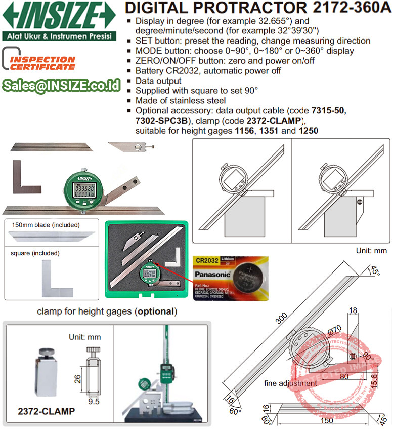 Busur derajat dari INSIZE Digital Protractor 2172-360A menawarkan solusi terbaik untuk ukur kemiringan bidang rata pada benda kerja dan sudutnya. Tampilan digital dengan mistar blade 300mm, membuat protractor atau busur digital INSIZE 2172-360A ini bisa digunakan sebagai mata ukur kombinasi pada alat ukur Height Gage maupun pada jig ukur.