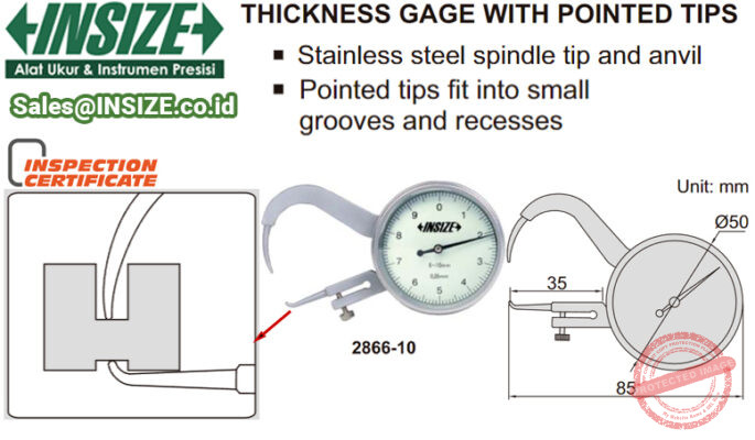 Dengan bentuk lengan mata anvil seperti cakar elang, INSIZE Thickness Gauge 2366-10 bisa menjangkau benda dengan ceruk sempit. INSIZE Dial Thickness Gauge 2866-10 juga menggunakan mekanisme pegas dan rack-pinion untuk menurunkan dan mengangkat anvil lebih presisi agar memastikan gaya torsi jepit yang konstan 7 – 10 Newton. Dengan desain yang ergonomis, INSIZE Thickness Gauge 2866 ini memiliki mata anvilnya tipe bundar setengah lingkaran tumpul.