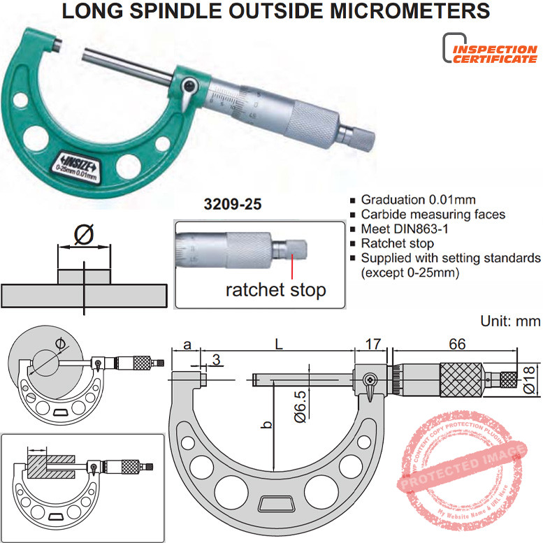 Nonius mikrometer sekrup ini sesuai sertifikasi standar Jerman DIN 863-1. Bagian bawah dari rahang ukur yang polos, nyaman digunakan di tangan. Mikrometer atau biasa disebut mikrometer sekrup INSIZE 3209 Outside Micrometer Long Spindle menggunakan 2 mekanisme interpolasi putar, yaitu secara gardan friksi untuk putaran besar dan sistem putar ratchet yang presisi.