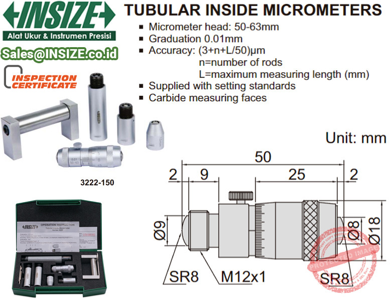 INSIZE Internal Micrometer 3222 merupakan alat ukur dimensi internal maupun diameter lubang dengan rentang ukuran Ø50mm hingga Ø63mm jika hanya menggunakan unit kepala saja (tergantung dari model yang digunakan), hingga Ø1500mm dengan tambahan extension rod (tergantung model).