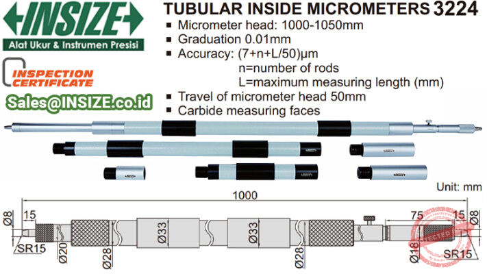 INSIZE Internal Micrometer 3224 merupakan alat ukur dimensi internal maupun diameter lubang dengan rentang ukuran Ø1050mm jika hanya menggunakan unit kepala saja (tergantung dari model yang digunakan), hingga Ø5000mm dengan tambahan extension rod (tergantung model).