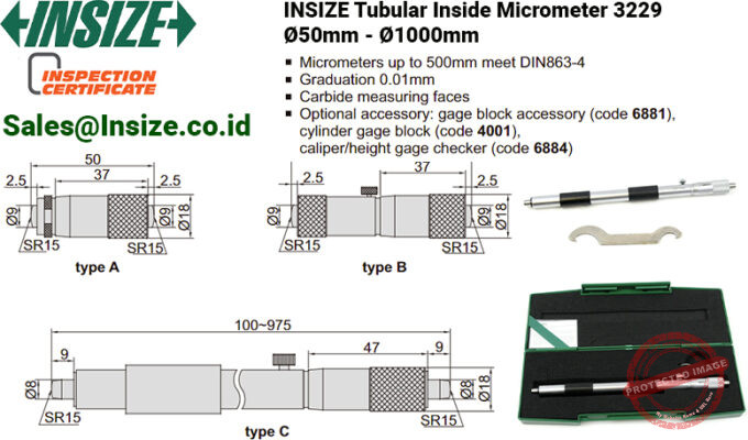 Fitur INSIZE 2-point Tubular Inside Micrometer 3229, (Telescopic Gage), Ø50mm – Ø1000mm: