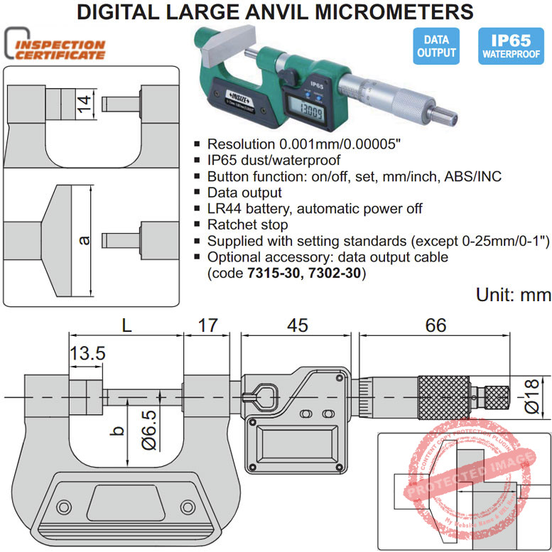 Mikrometer atau biasa disebut mikrometer sekrup INSIZE 3534 Digital Large Anvil Micrometer IP65 menggunakan 2 tipe mekanisme interpolasi yang merupakan kombinasi putar sistem putar ratchet yang presisi dan friksi dengan kuncian. Ujung mata ukur anvil terbuat dari logam keras Carbide yang tahan gores. Anda bisa rekam data ukurnya ke software spreadsheet komputer dengan kabel data yang dijual terpisah.