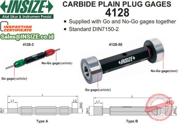 INSIZE 4128 Carbide Plug Gauge juga tersedia sebagai unit set kotak dengan sertifikat kalibrasi pabrikan. Toleransi diameter INSIZE 4128 Carbide Plug Gauge ini bervariasi, dalam setiap tingkatan, berdasarkan pada diameter nominal.