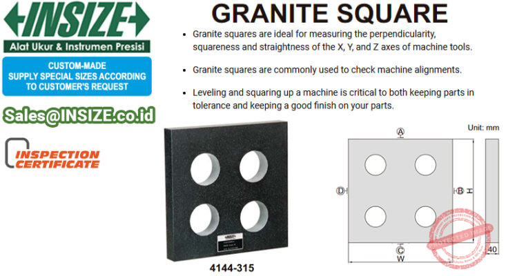 INSIZE Granite Master Square 4144-315 memungkinkan pengaturan lay out ukuran 315mm x 200mm dan flatness; 1.1µm dalam sudut kotak 90°. Dimensi Siku dari INSIZE Granite Master Square 4144-315 sudah terkalibrasi hingga 90° untuk memeriksa diameter, paralelisme dan keselarasan. Block square ini juga bisa digunakan sebagai pembanding akurasi pada instrumen presisi lain, alat permesinan maupun sebagai skala standar pengukur panjang dengan sertifikasi kalibrasi pabrikan yang baik.