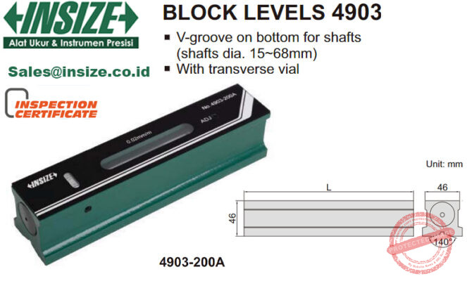 Cairan “spirit” vial dalam unit waterpas INSIZE Block Level Spirit 4903 itu memiliki aditif untuk perlindungan sinar UV dan pada suhu kinerja maksimal pada suhu 20°F atau -28.88°C hingga 130°F atau 54.44 °C. Ada 6 model Block Level Spirit INSIZE 4903 dengan rentang ukur dan tingkat sensitifitas yang berbeda. Level Spirit digunakan untuk pengecekan kerataan dengan basis prismatik yang sudah terkalibrasi rata dalam rentang pilihan alas 150mm/ 200mm/ 300 mm, dan graduasi pada cross bubble level.
