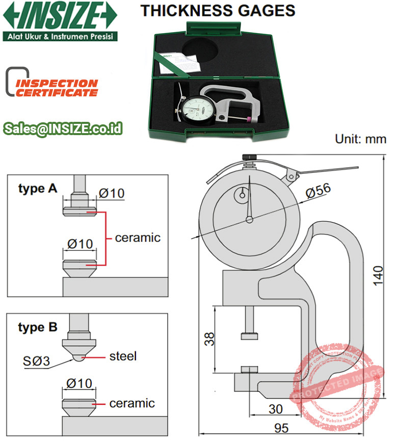 Thickness gage ini tersedia dalam 2 model dengan mata anvilnya tipe A yaitu flat terbuat dari material Zircon ceramic dan tipe B yang cembung dari material Steel dan Ceramic. Bagian mata anvil dari material keramik memang cocok untuk material yang sifatnya abrasif seperti kertas dan pelat aluminium maupun melakukan komparasi ukur pada benda yang bersuhu agak panas/dingin atau suhu ruangan diatas 20°C atau lebih, misalnya ukur kompratif benda logam yang memuai.