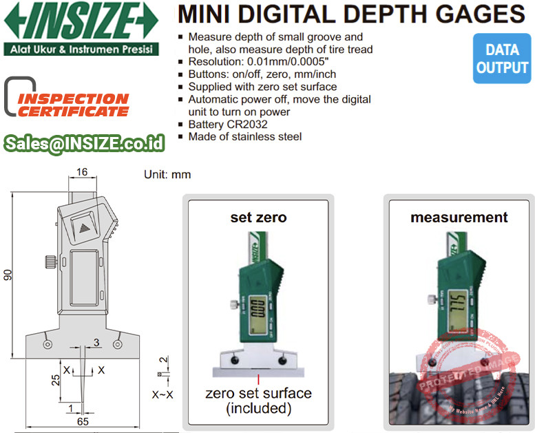 INSIZE Digital Depth Gauge 1145-25A merupakan alat ukur kedalaman lubang, celah, step, cavity, bore, dengan rentang ukur hingga 25mm dan Akurasi: ±30µm. INSIZE Digital Depth Gage 1140 ini juga memiliki sensor skala tipe kapasitif seperti kaliper digital untuk pengukuran benda kerja seperti lubang fastener, kedalaman ulir pada fastener, kedalaman ulir ada traksi ban, ukur keausan pada gear maupun gardan spline dan lainnya.
