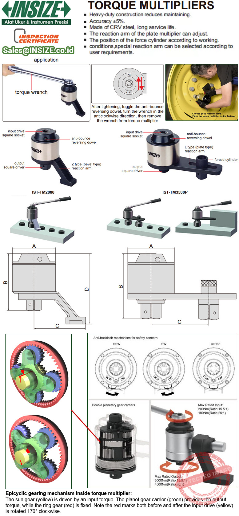 Dengan beberapa mekanisme gardan planetary internal sepenuhnya berputar dengan rasio yang beragam tergantung dari modelnya. INSIZE Manual Torque Multiplier IST-TM terbuat dari material Chromium-vanadium steel dan dikemas dalam paket koper agar bisa dibawa ke mana saja.