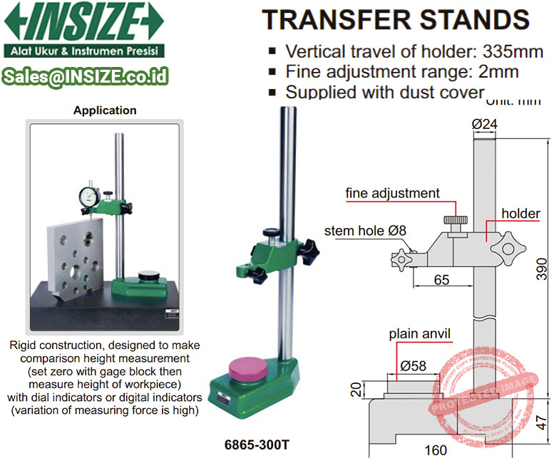 INSIZE Transfer Stand 6865-300T menawarkan stand bantu ukur dial test gauge dan plunger gauge yang memilki ketinggian setel Travel hingga 335mm.. Dudukan indikator memiliki base dari material Ceramic. Dengan bobot yang lumayan, anda bisa memiliki alas stabil yang dipasangkan dengan tiang vertikal kaku dengan landasan baja datar atau bergerigi berbentuk persegi panjang atau bulat tempat indikator dipasang dan dapat disesuaikan.