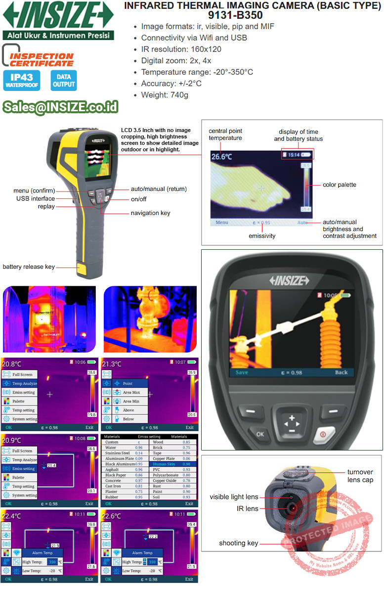 INSIZE 9131-B350 Thermal Imaging Camera merupakan alat inspeksi visual untuk mengamati, mendeteksi dan mengukur energi inframerah pada obyek. Dengan resolusi 160×120, sensor kamera pada INSIZE 9131-B350 bisa mendeteksi dan mengukur energi inframerah dari objek yang dibidik. Selain tampilan inframerah, INSIZE Thermal Imaging Camera 9130-H360 juga menyertakan kamera cahaya tampak yang secara otomatis menangkap gambar digital standar saat anda menjepret gambar.